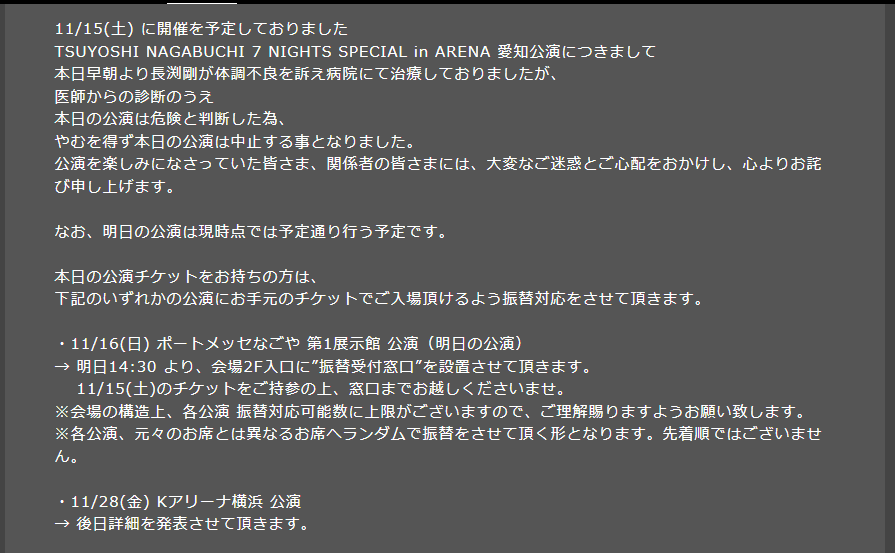 「本日早朝より長渕剛が体調不良を訴え病院にて治療しておりましたが、医師からの診断のうえ本日の公演は危険と判断した為、やむを得ず本日の公演は中止する事となりました。」