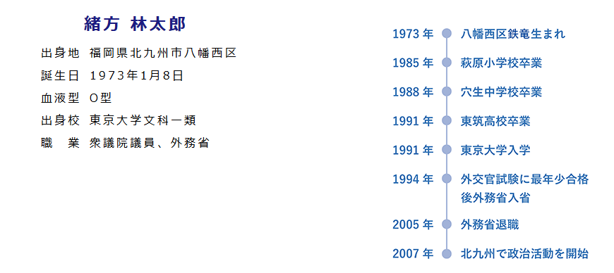 - 1973年福岡県北九州市八幡西区生まれ、東筑高校から東大法学部中退、在学中外交官試験合格で1994年外務省入省という学歴・経歴