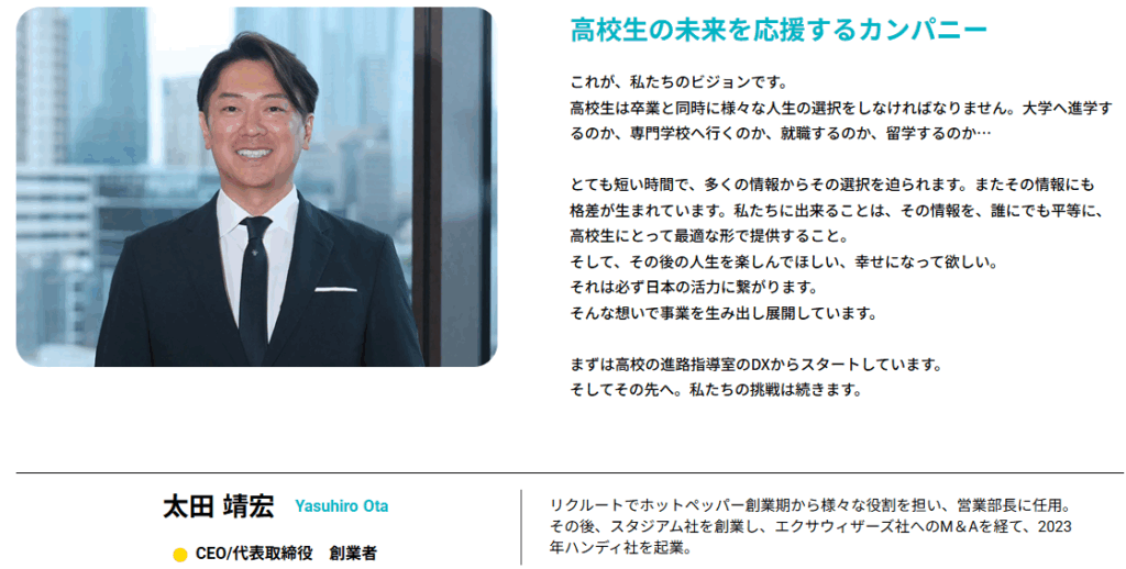 近年は同社を売却し、2023年7月から教育支援サービス企業「ハンディ株式会社」代表取締役として活動中です。